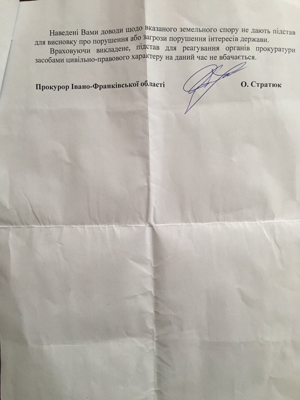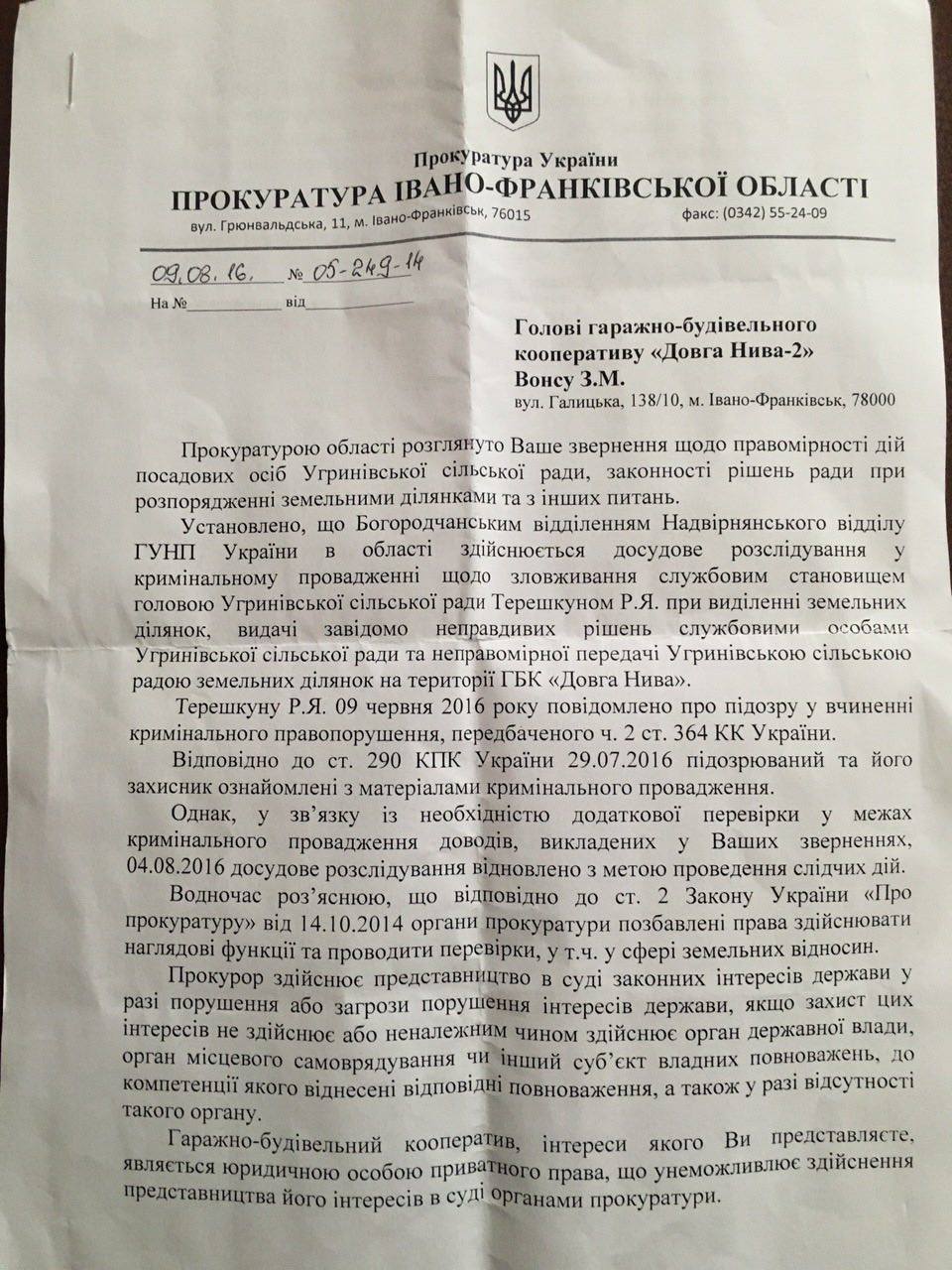 «Установлено, що Богородчанським відділенням Надвірнянського відділу ГУНП України в області здійснюється досудове розслідування у кримінальному провадження щодо зловживання службовим становищем головою Угринівської сільської ради Терешкуном Р.Я. при виділенні земельних ділянок, видачі завідомо неправдивих рішень службовими особами Угринівської сільської ради та неправомірної передачі Угринівською сільською радою земельних ділянок на території ГБК «Довга Нива». Терешкуну Р.Я. 09 червня 2016 року повідомлено про підозру у вчиненні кримінального правопорушення, передбаченого ч.2 ст. 364 КК України… відповідно до ст.2 ЗУ «Про прокуратуру» від 14.10.2014 органи прокуратури позбавлені права здійснювати наглядові функції та проводити перевірки, у т.ч. у сфері земельних відносин…», – йдеться у документі.