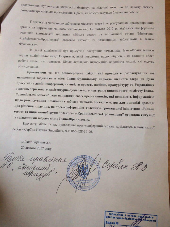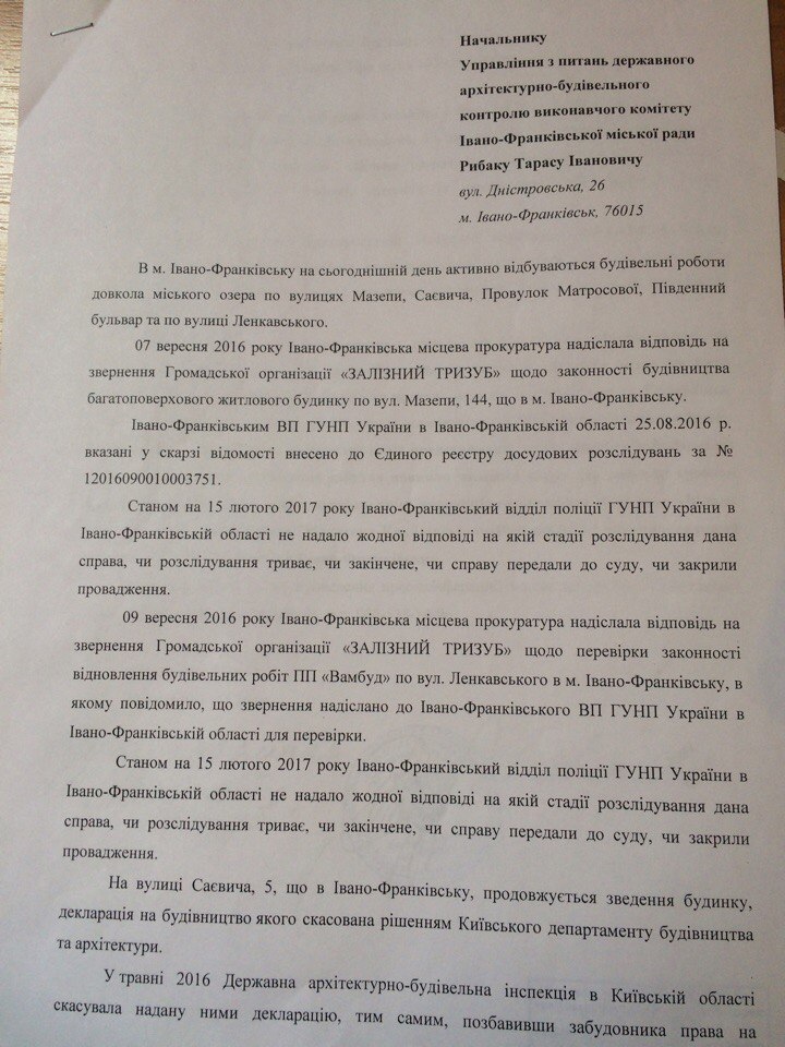 Так, за словами т.в.о заступника прокурора Івано-Франківська Любомира Хамиса, будівельні роботи на вулиці Ленкавського не проводяться на самовільно захопленій ділянці, адже є договір про оренду між забудовником і міськрадою. Крім того, була проведена будівельна експертиза, згідно з якою порушень проекту немає, пише Фіртка.